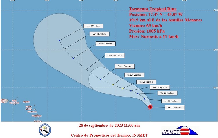 El Instituto cubano de Meteorología informó hoy sobre la formación en el Atlántico central de la tormenta tropical Rina, décimo séptimo organismo nombrado de la actual temporada ciclónica.