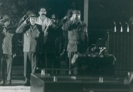 La ceremonia hace 26 años, de la llegada de los osarios del comandante argentino-cubano y otros guerrilleros al memorial Ernesto Che Guevara, fue presidida por el líder histórico de la Revolución cubana Fidel Castro, quien encendió la llama eterna a los caídos dentro del recinto heroico en esta urbe en el centro de Cuba.