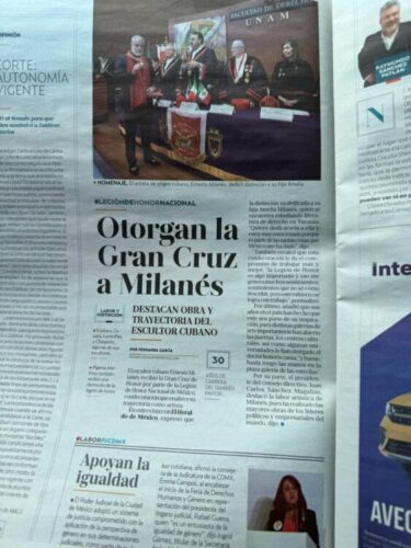 El reconocido pintor, dibujante y escultor Ernesto Milanés Ruiz (Santiago de Cuba, 1967), recibió la Gran Cruz que lo destaca como miembro ilustre de la Legión de Honor Nacional de México, a la cual pertenece desde hace cinco años por sus relevantes aportes a las artes visuales y a la cultura en general de ese hermano territorio centroamericano.