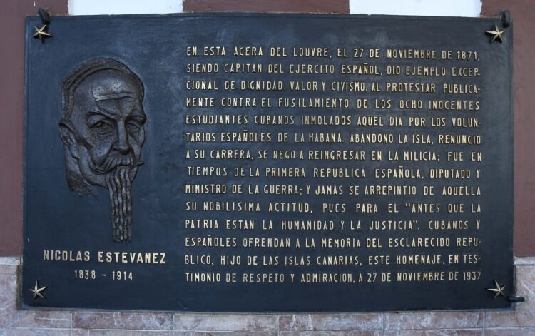 En el mismo momento en que se escuchaban las descargas de los disparos que les estaban arrancando la vida a los ocho estudiantes de Medicina, víctimas de la saña del Cuerpo de Voluntarios, el capitán del ejército español Nicolás Estévanez, que se encontraba en la Acera del Louvre, rompió su espada y arrancó los galones de su charretera en repudio a tan abominable crimen. Los trabajadores del hotel Inglaterra tuvieron que contenerlo, tal era su indignación.