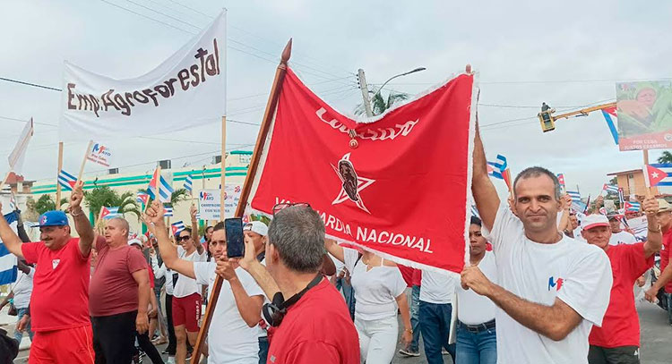 Banderas cubanas y de diferentes países y pancartas identificativas de colectivos laborales, dieron colorido y combatividad a la celebración en cuyo inicio la joven trabajadora Darian Oramas Campos, de la Organización Básica Eléctrica de La Habana, condenó el inhumano e injusto bloqueo que por más de 60 años mantiene el imperialismo yanqui contra Cuba y el genocidio que comete Israel entre la población palestina, en su mayoría niños, mujeres y ancianos a quienes sistemáticamente se les priva el derecho a la vida.