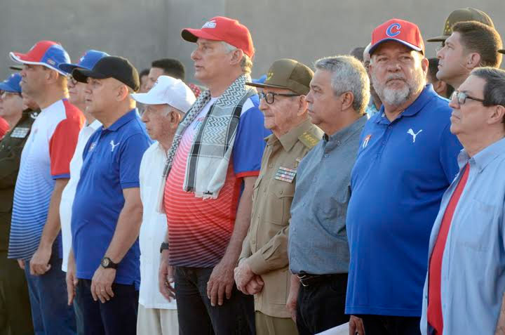 El general de Ejército Raúl Castro Ruz, líder de la Revolución cubana, Miguel Díaz-Canel Bermúdez, Primer Secretario del Comité Central del Partido Comunista de Cuba y Presidente de la República, Ulises Guilarte de Nacimiento, miembro del buró político y secretario general de la Central de Trabajadores de Cuba, presiden el acto, junto a otras autoridades del Partido, el Consejo de Estado, organizaciones políticas y de de masas.