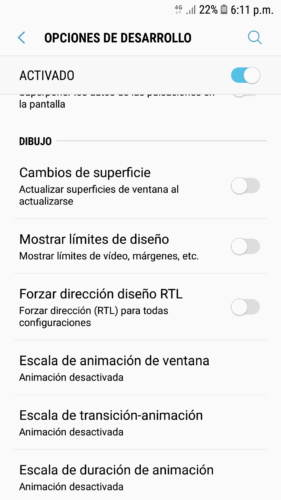 Una vez dentro de esa sección deberás haber clic en cada opción y seleccionar Animación desactivada: escala de animación de ventana, escala de animación de transición y escala de duración de animación.