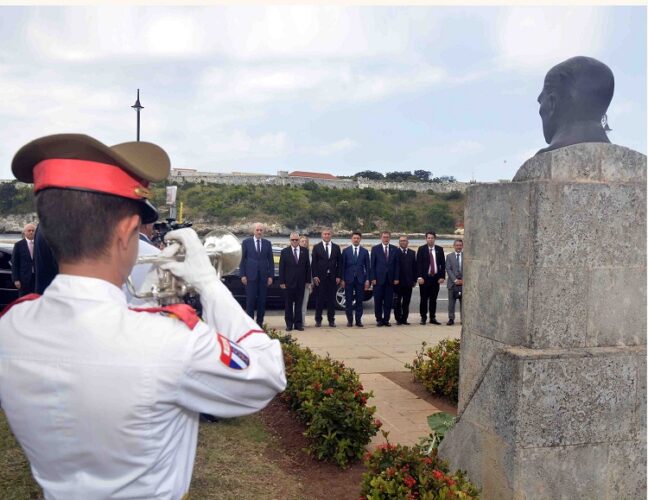 Acompañado por Homero Acosta Álvarez, secretario del Parlamento cubano, colocó una ofrenda floral ante el busto del prócer turco, ubicado en la Avenida del Puerto en La Habana Vieja, en cuyo basamento se lee «Paz en el país, paz en el mundo».