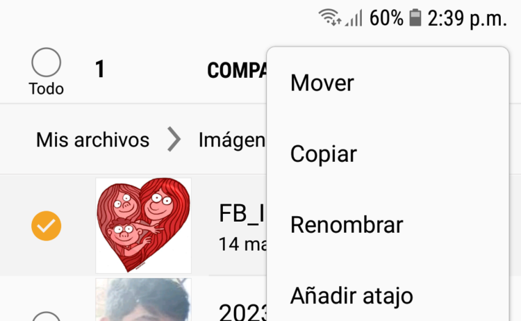 Luego, hay que tocar los tres puntos que están en la parte superior derecha para que se despliegue un menú donde se incluye Renombrar, que al ser seleccionado presentará marcado el texto para renombrar.