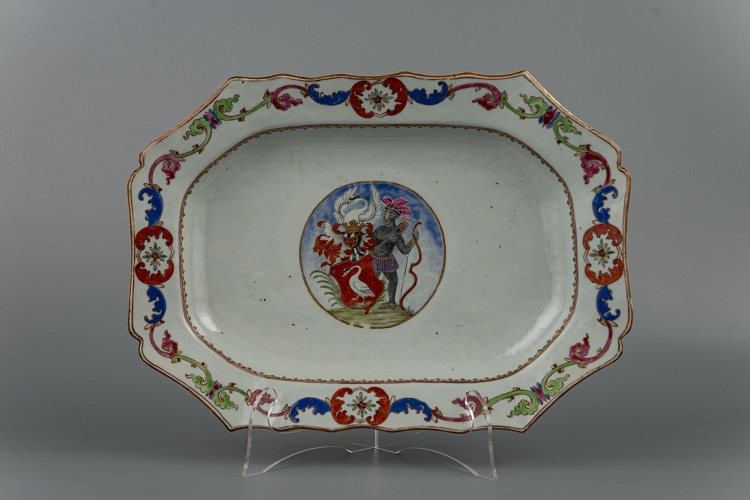 El conjunto forma parte de lo que se conoce como la porcelana de la Compañía de las Indias Orientales e, incluso, dentro de esta categoría podríamos ubicarla en una segunda que sería “la porcelana heráldica”, producida en China y Japón para Europa. Como bien lo indica su nombre, la vajilla se caracteriza por presentar en su decoración central la figura de un personaje africano el cual sostiene un escudo con heráldica singular. Se trata del blasón de la familia Paravicini di Capelli, destacado núcleo que, aunque de raíces italianas, se asentaron desde muy temprano (s.XVII) en Los Países Bajos. Según datos online, los Paravicini di Capelli fueron destacadas figuras de la vida política y militar sobre todo durante el siglo XVIII. Esta familia es referenciada en El Patriciaat de los Países Bajos, el Libro Azul de la sociedad neerlandesa que contiene la genealogía de aquellas familias que desempeñaron un papel destacado en esa nación en los últimos dos siglos.