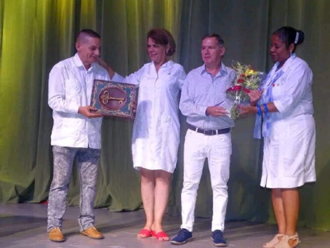Bárbara Mínguez, presidenta de la Asamblea Municipal expresó que la urbe se enorgullece de haber conquistado el corazón de sus hijos, al tiempo que entregó la Llave de la Ciudad al periódico Escambray, la condición de Hijo Ilustre a Alexis Lorente, gobernador de la provincia y el Escudo de Sancti Spíritus a Roberto Vitlloch, director de la Oficina del Conservador.