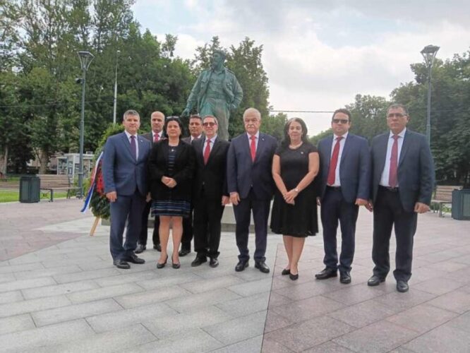 “Al líder histórico de la Revolución cubana del pueblo y Gobierno de Cuba”, se lee en las bandas del arreglo floral depositado por el ministro de Relaciones Exteriores en la escultura erigida en su honor en el distrito de Sokol, de Moscú.