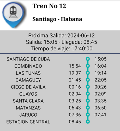 No obstante existir esa posibilidad le ofrecemos dos imágenes tomadas de la APK Trenes con el itinerario de La Habana a Santiago de Cuba y viceversa.