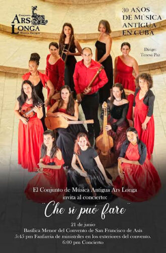 Como parte de la celebración por los 30 años de fundados, el Conjunto de Música Antigua Ars Longa ha previsto un concierto que tendrá lugar el venidero viernes 21 de junio en la Basílica Menor del Convento de San Francisco de Asís.