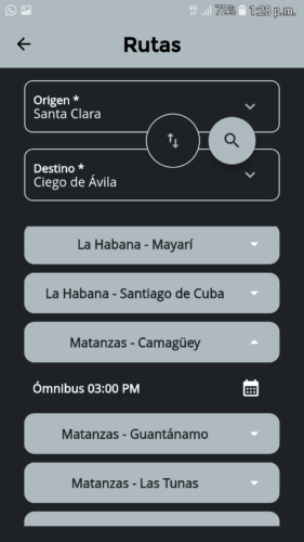 Toque las tres rayitas que están en la parte inferior derecha y después en RUTAS., donde debe escribir el origen y el destino del viaje, y tocar la lupa.