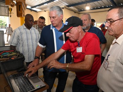 Díaz-Canel repasó las potencialidades de la empresa para el ensamblaje de paneles fotovoltaicos y sistemas de acumulación y tecnologías afines, para su uso en casas de familias, y los felicitó por la calidad de sus producciones y el prestigio de que gozan en el país.