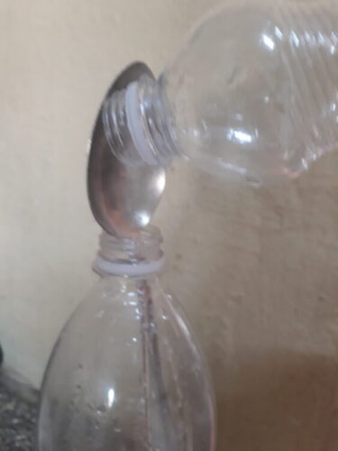 Si usted se ve en esa situación, puede improvisar un embudo, pero requiere de una cuchara, la cual deberá colocar dentro de la botella receptora como se muestra en la imagen y verter el líquido.
