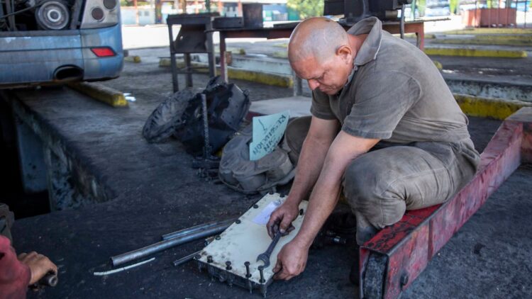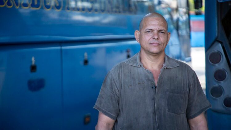 Ante el déficit de partes, piezas y aceites, los mecánicos de Ómnibus Nacionales como Manuel Issac, hacen hasta lo imposible para reparar las guaguas: