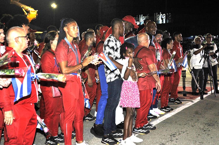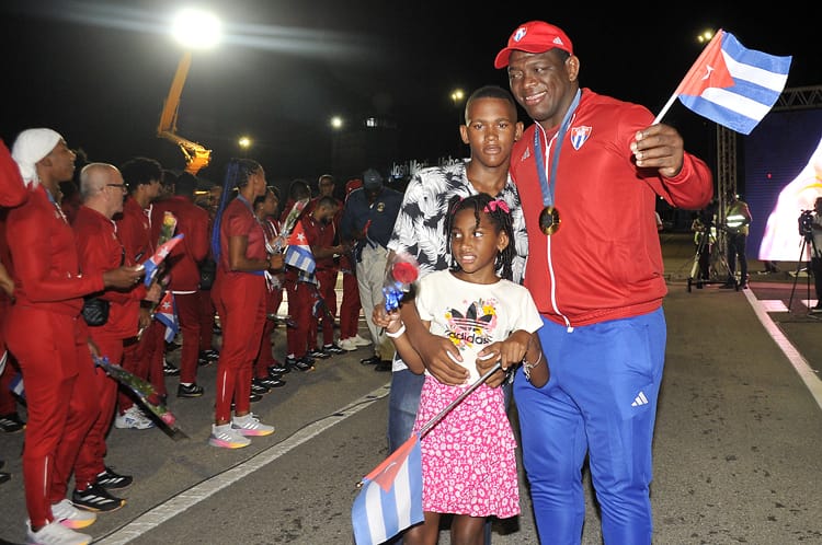 La bandera cubana, en manos del pentacampeón olímpico de lucha greco Mijían López (130 kg) y el recién estrenado monarca de los 63 kilogramos, el boxeador Erislandy Álvarez, descendió por las escalerillas del avión para guiar a los deportistas de la isla que regresaron hoy al país luego de su estancia en París para los Juegos Olímpicos.