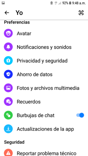 Aparecerá otro menú que deberá desplazar hacia abajo hasta encontrar PREFERENCIAS, donde marcará BURBUJAS DE CHAT.
