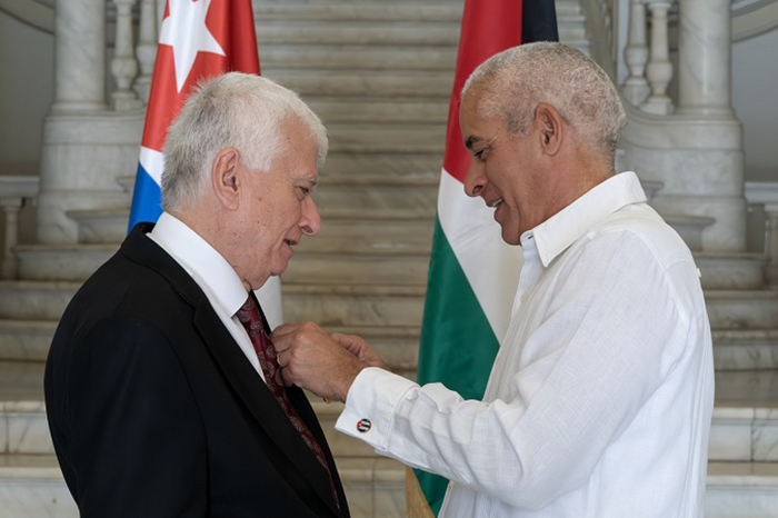 A nombre del Presidente de la República, el viceministro primero de Relaciones Exteriores, Gerardo Peñalver Portal, impuso el alto reconocimiento al diplomático palestino, quien próximamente terminará su misión al frente de la Embajada de ese país en la Isla.