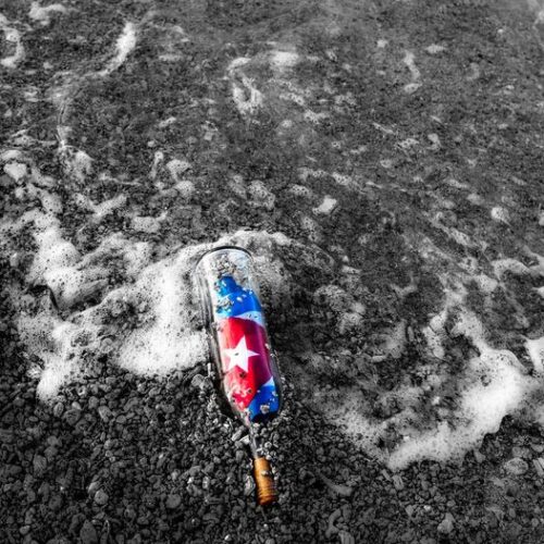 Todo eso pensaba, sentía y amaba cuando pasaba por delante de cada foto de Chile y bebía las décimas de Pimienta. Pero hubo una que me robó los ojos y escogí para ilustrar este post. Una botella en medio de olas, con una bandera cubana dentro. Así lo resumió el poeta y no hay más nada que aportar:
