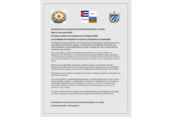 Esperamos que los gobiernos solidarios con Cuba, ofrezcan su apoyo tan necesario en este difícil momento, destacó el llamamiento de la Asociación azerbaiyana de solidaridad con la isla.