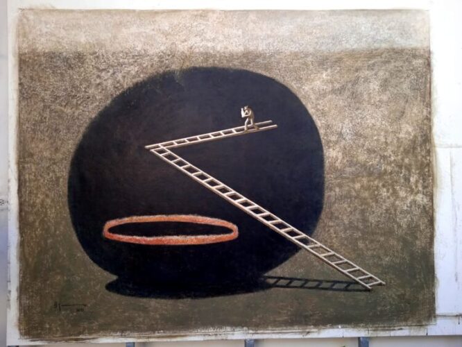 De la primera exposición, incluida en el programa de la 14 Bienal de La Habana, seleccionó algunos de los cuadros hechos en el 2021, en los que sobresalen valoraciones y puntos de vista que ya no solo tienen que ver con categóricas reflexiones sobre el equilibrio entre el ser y el no ser, el bien y el mal, lo conocido y lo desconocido…; sino asimismo con determinados procesos relativos al desarrollo personal del artífice, así como a transformaciones socio-culturales, políticas, religiosas e históricas de las que saca hondas conclusiones mediante un arte desprovisto de trivialidades, ausente de guiños festinados que intenten el fatuo encantamiento, para tratar de buscar la estética de la concreción humana.