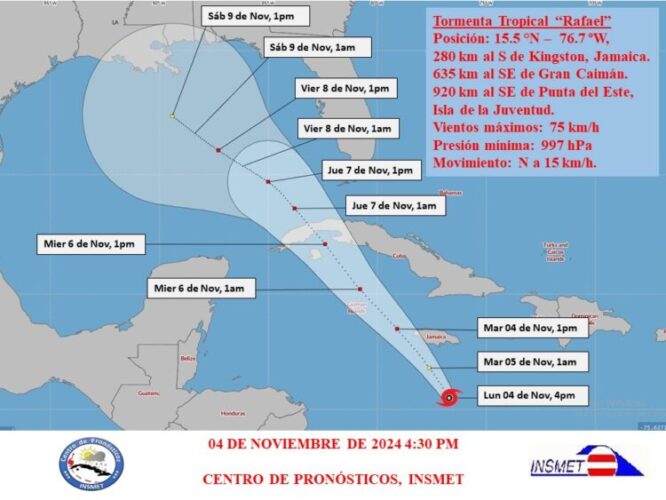 Durante la tarde de hoy, la Depresión Tropical Dieciocho, localizada en el mar Caribe central se ha organizado mejor y un nuevo vuelo de reconocimiento encontró que se ha convertido en la decimoséptima tormenta tropical de la actual temporada ciclónica, nombrada Rafael. Los vientos máximos sostenidos se incrementaron hasta los 75 kilómetros por hora, con rachas superiores y la presión mínima central descendió a 997 hectoPascal.