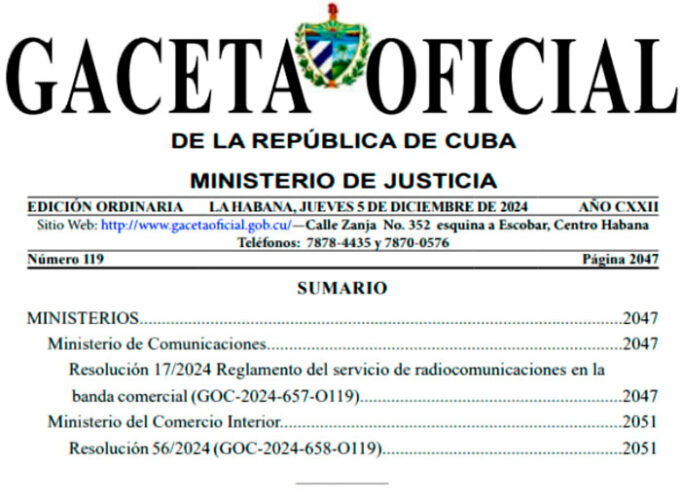 La Gaceta Oficial No. 119 (ordinaria), del 5 de diciembre de 2024, publicó la Resolución 56, del 15 de octubre de 2024, de la ministra del Comercio Interior, que establece el ordenamiento de la comercialización mayorista y minorista por los actores económicos no estatales.