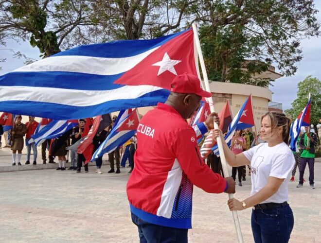 Walter Simón Noris, primer secretario del Comité Provincial del Partido, entregó a Milena Pérez Correoso, primera secretaria del Comité Provincial de la Unión de Jóvenes Comunistas, la bandera de la estrella solitaria que preside la Caravana portadora, también, de banderas del Movimiento 26 de Julio y otros emblemas enarbolados en las luchas por la liberación nacional.