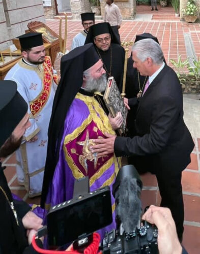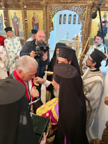 Este domingo el primer secretario del Comité Central del Partido y presidente de la República de Cuba, Miguel Díaz-Canel Bermúdez, fue galardonado con la Orden del Patriarca Ecuménico Bartolomeo «Estrella», en reconocimiento al apoyo que el Estado cubano ha brindado a la Iglesia Ortodoxa griega en nuestro país.