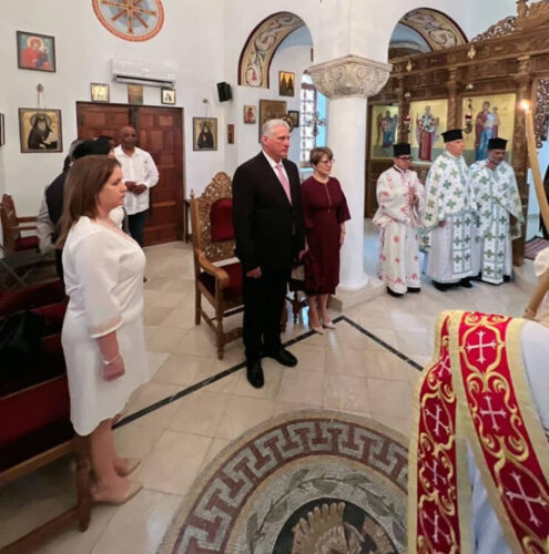 Hasta la Sacra Catedral Ortodoxa Griega San Nicolás de Myra, consagrada hace dos décadas en el Centro Histórico Habanero, llegó el jefe de Estado, donde fue recibido por el representante del Patriarcado Ecumenico de visita en Cuba, el Arzobispo de Australia de la Iglesia Ortodoxa Griega, Su Eminencia Makarios.