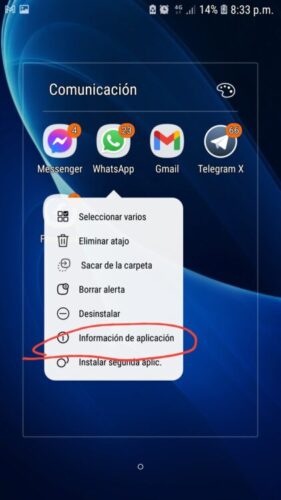 Presione el icono de WhatsApp, y entre a Información de la aplicación: