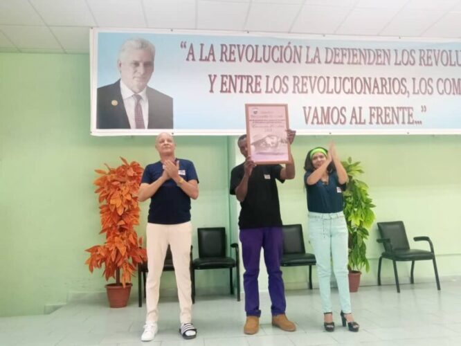 Fibian Hernández Blanco, directora de la UEB, y Diego Andrés Romero Machado, secretario de la sección sindical de la empresa, recibieron de manos de Maité Rodríguez Manso, miembro del secretariado del Sindicato Nacional de Trabajadores de Energía y Minas, el certificado que acredita esta distinción.