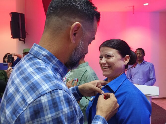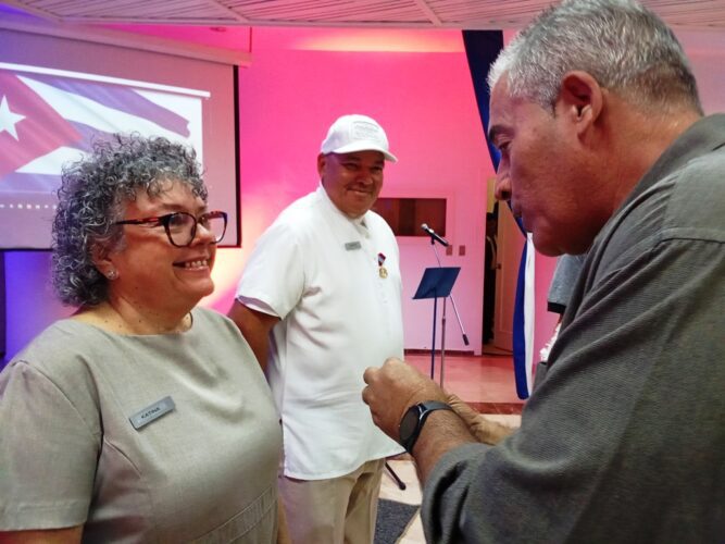 La camarera María Josefa Quesada recibió su distinción de manos del delegado del MINTUR en Matanzas, Luis Martínez. Foto: Noryis