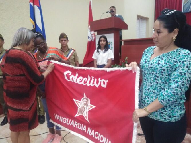 En representación del colectivo recibieron la bandera con la efigie de Lázaro Peña, la secretaria general del Buró Sindical y el gerente general de la entidad, Soraya García Cabrera e Iván Paz Pérez de Corcho, respectivamente.