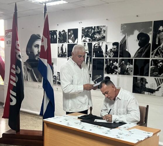 Participaron en la ceremonia de la cancelación Yamilín González Milián, vice ministra primera del Mindus; Carlos Alberto Pavón Carbonel, presidente del GEIQ y Eddy Betancourt Escobar, asesor del presidente del Grupo Empresarial Correos de Cuba.