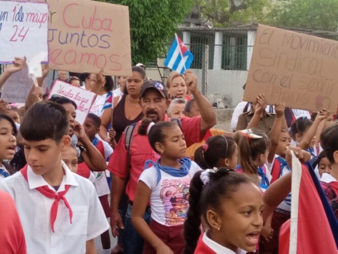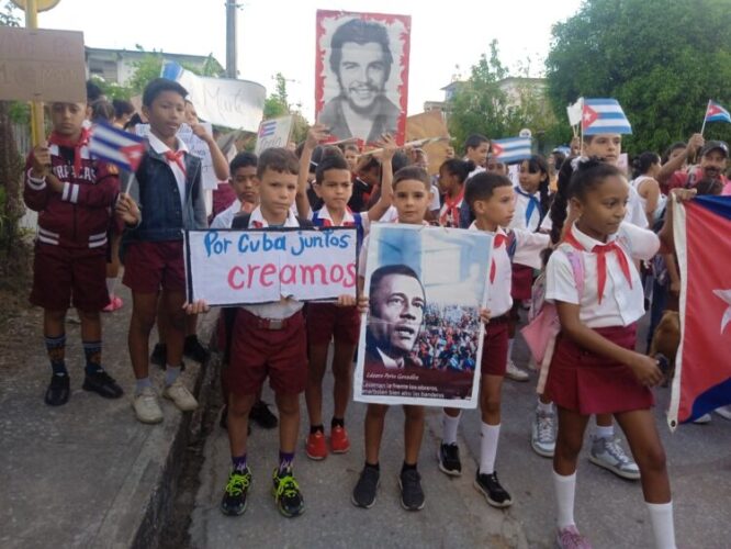 Las arterias de estas zonas aledañas fueron coloreadas con la alegría de pioneros, maestros, obreros, personal de la producción y los servicios y pueblo en general, quienes expresaron su compromiso con trabajar porque el territorio alcance solidez en los indicadores macro económicos.