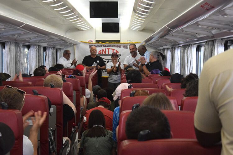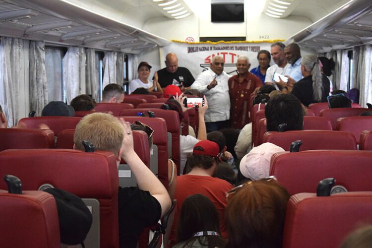 Desde uno de los confortables vagones de los trenes que normalmente transportan a pasajeros cubanos que viajan hacia las provincias orientales, los asistentes pudieron conocer detalles acerca del sistema ferroviario en la nación, a la vez que intercambiaron experiencias e inquietudes con trabajadores del sector.