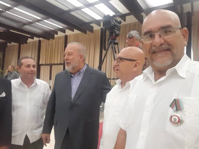 Director de la EMPAI (primero de derecha a izquierda) junto a Ulises Guilarte e Isdalys Rodríguez, secretario general y segunda secretaria de la CTC, el día de la entrega de la Orden Lázaro Peña de Primer Grado. Foto: Alejandro Acosta