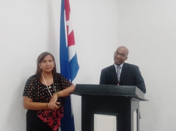 De izquierda a derecha Dra. C.Grisel Argilagos Casazayas, quien dictó la conferencia acerca del embarazo ectópico, y el Dr. Mac Johnson, ginecobstetra y miembro del comité organizador del Simposio (De la autora)