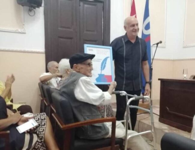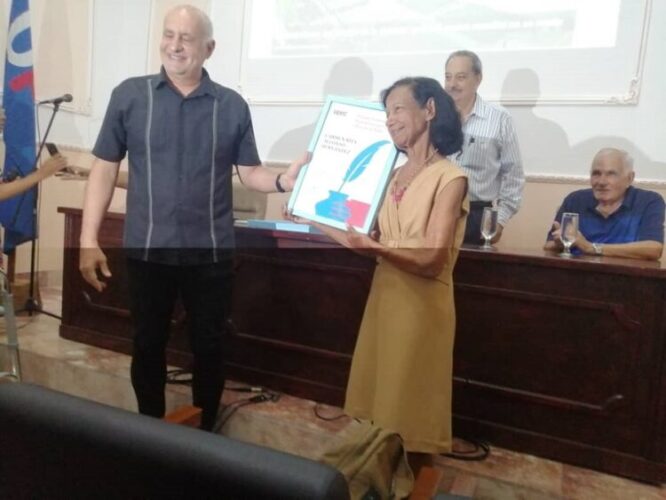 El alto estimulo fue entregado por el Presidente de la Unión de Periodistas de Cuba, Ricardo Ronquillo Bello, durante una ceremonia efectuada en medio de una amena asamblea general de jubilados pertenecientes a la institución.