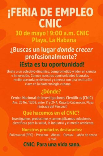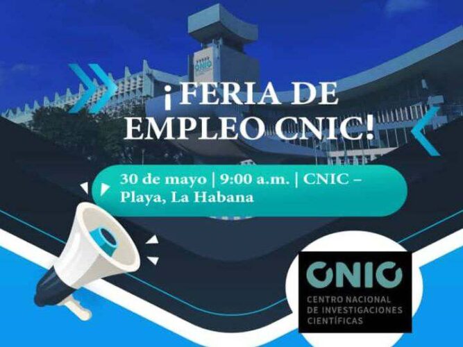 El Centro Nacional de Investigaciones Científicas (CNIC) convoca a todos los interesados a participar en su Feria de Empleo, que se celebrará el próximo 30 de mayo a las 9:00 a. m., en su sede ubicada en Ave. 25 No. 15202, entre 21 y 21-A, Reparto Cubanacán, municipio Playa, La Habana (Entrada del Personal).