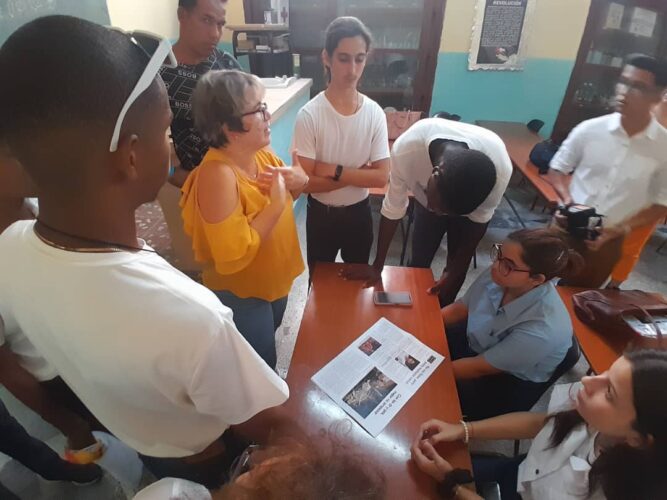 “El colectivo de Trabajadores consideró que no era suficiente organizar charlas motivadoras, por eso propusimos a la escuela hacer un periódico con temas que consideran vitales. Los alumnos del taller de Periodismo escribieron los textos, aportaron imágenes, escogieron el nombre de la publicación, los colores… Lo nuestro fue poner el oficio”, explicó Yimel Díaz Malmierca, presidenta de la delegación de base de la Upec y editora jefa de las páginas Internacionales de Trabajadores.