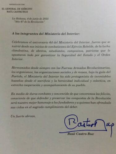 «Celebramos el aniversario 64 del Ministerio del Interior, fuerza que se nutrió desde sus inicios de combatientes del Ejercito Rebelde, de la lucha clandestina, de obreros, estudiantes, campesinos, patriotas que lo apostaron todo por garantizar la Seguridad del estado y el Orden Interior» expresa un fragmento de la misiva