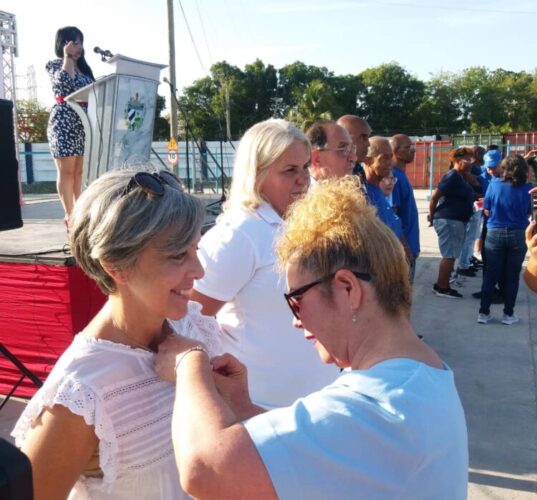El máximo dirigente obrero cubano impuso la distinción al grupo, junto a Yudi Mercedes Rodríguez Hernández, miembro del Secretariado del Comité Central del Partido y jefa de su Departamento de Atención a los Servicios.