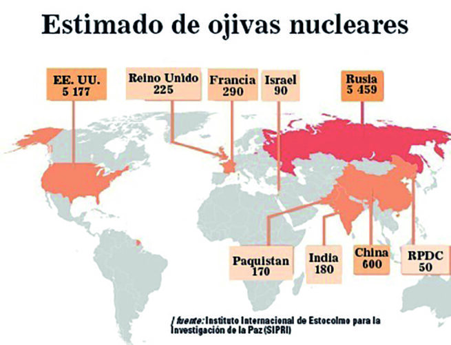 El informe anual del Instituto Internacional de Estocolmo para la Investigación de la Paz (SIPRI) refiere que hasta enero del 2025 existían 12 mil 241 ojivas nucleares en el mundo. Unas 9 mil 614 de ellas están listas para ser usadas, se encuentran en arsenales militares o desplegadas en bases de misiles y bombarderos estratégicos, fundamentalmente de Rusia y Estados Unidos.