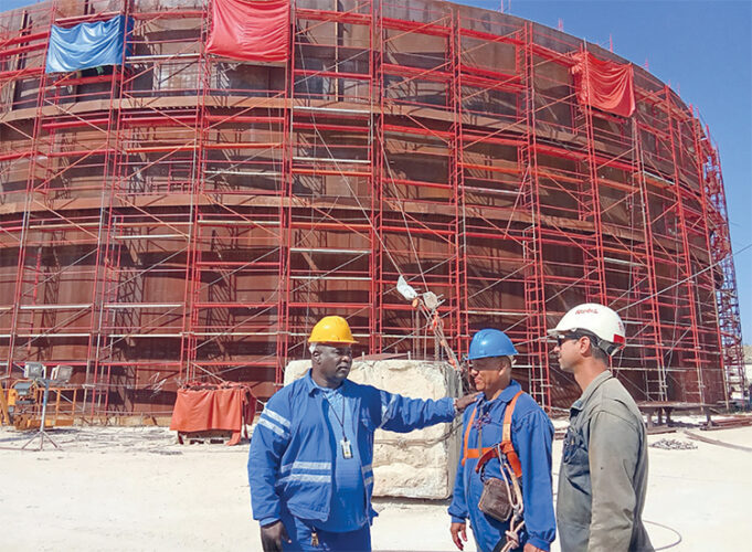 Homologado como soldador de planchas y tuberías, Alexander Hechavarría Linares ha participado en la construcción de otros depósitos. Cuando lo trajeron de apoyo desde Santiago de Cuba, no imaginó cuánto complicarían las faenas en aquella primera etapa, la densidad de las láminas al extremo de quedar roto el cronograma. Iniciada dos años atrás, la inversión de este envase debió finalizar en 16 meses, exactamente en octubre de 2024. Luego se reprogramó para noviembre de este año.