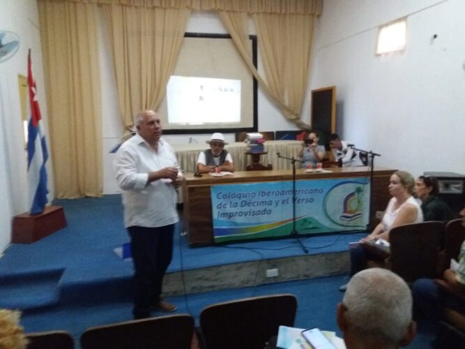 Como en años anteriores, la Jornada Cucalambeana contó con un espacio para la reflexión teórica, y disfruté mucho ese espacio. El Coloquio Iberoamericano de la Décima, en su edición 44, abordó la Controversia del Siglo en su aniversario 70 —recordar que fue protagonizada en 1955 por dos enormes poetas, Jesús Orta Ruiz (el Indio Naborí) y Angelito Valiente—; exploró facetas interesantes del quehacer de ellos por separado; se acercó a experiencias de intercambio con poetas canarios; divulgó la vida literaria decimística en territorios como Velasco (de Gibara, Holguín), Camagüey, San José (del municipio de Colombia, Las Tunas); y ofreció útiles experiencias del trabajo pedagógico con la estrofa nacional, entre otros temas de indudable provecho para los estudiosos de esta modalidad compositiva en sus vertientes oral improvisada y escrita.