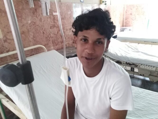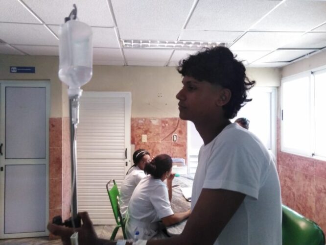 «Me sentí mal, estaba deshidratado, el médico indicó, además de la hidratación, reposo, pero qué va decidí continuar la guardia ante la falta de personal, esto aquí en el hospital está duro con los enfermeros somos cuatro en mi sala con ciclo de tres por uno», expresa mientras se acomoda para seguir su tratamiento.