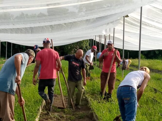 «Este fin de semana hacia la producción de alimentos fueron los obreros del sindicato Alimentaria y Pesca; en Nueva Gerona trabajaron en la finca de plantas proteicas, mientras en el poblado de La Fe, el colectivo laboral de bebidas y refrescos y también la Federación de Mujeres Cubanas, los Comites de Defensa de la Revolución y la Asociación de Combatiente de la Revolución Cubana.