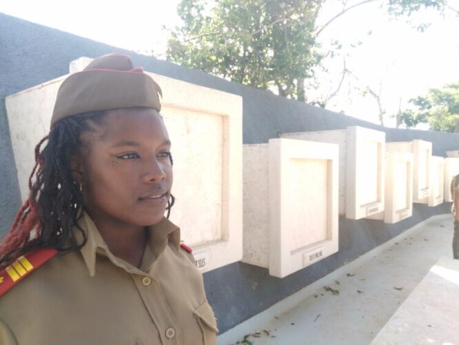A su lado, Isamay Beatriz Curbelo Hernández, es parte de los seis relevos de camilitos que esta mañana custodian los restos de los moncadistas artemiseños, una estudiante de duodécimo grado, aspirante a estudiar Medicina, que vive en Bahía Honda, el más distantes de los municipios de la provincia y nunca había estado en el Mausoleo.