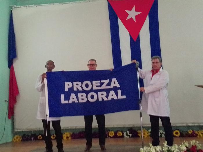 El doctor Manuel Rivero Abella, director general de Salud en la capital, entregó la bandera de Proeza laboral al Director del Hospital Dermatológico Dr. Guillermo Fernández Hernández-Baquero, a los doctores Rolando Montero Díaz, Héroe del Trabajo de la República de Cuba; y Roberto Hernández Arrebato, secretario general del Buro Sindical del emblemático centro de la Salud, enclavado en el Santuario nacional de San Lázaro, en el Rincón.